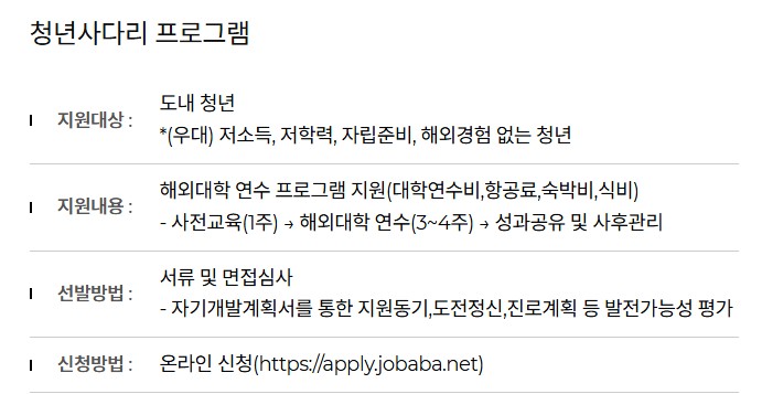 경기청년사다리 프로그램의 가장 큰 장점은 해외 대학에서의 연수 기회를 제공한다는 점이에요. 이를 통해 청년들은 글로벌 인재로 성장할 수 있는 발판을 마련할 수 있어요. 프로그램에 참여하면 사전 교육, 해외 대학 연수, 그리고 사후 관리까지 포함된 전 일정의 운영 비용을 지원받게 되는데요, 형편이 어려운 청년들에게는 정말 큰 도움이 될 거예요.