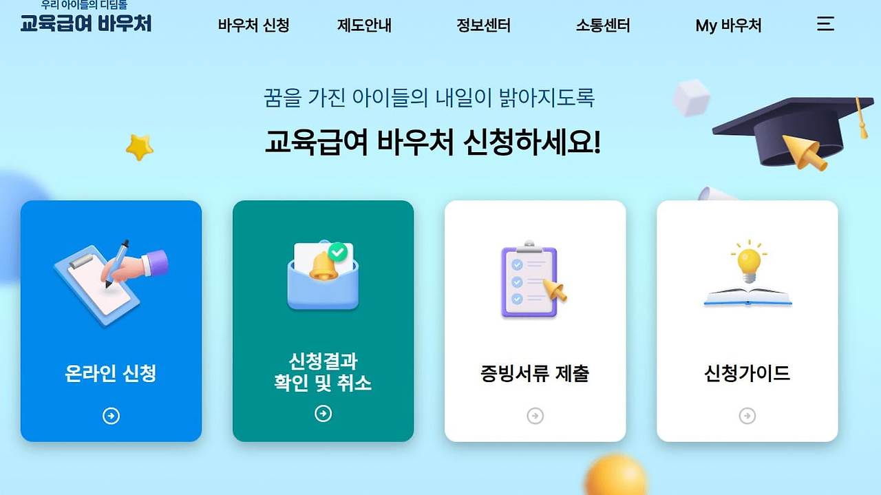 - 온라인 신청 : 교육급여 바우처 홈페이지(https://e-voucher.kosaf.go.kr/)에서 신청할 수 있어요.