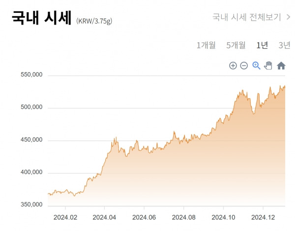 현재 국내 금시세는 어떤지 살펴볼까요? 2024년에 1돈(3.75g)의 금 가격은 약 350,000 원에서 시작해, 연말까지 약 550,000 원으로 상승하였고 2025년에는 수요가 좀더 몰려 점진적인 상승을 예측합니다.
