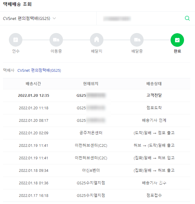 - 배송 상황 추적하기 : 배송이 시작되면, 제공된 트래킹 번호로 배송 상황을 확인하세요. 아래 이미지는 배송 정보 로그를 보여줍니다.