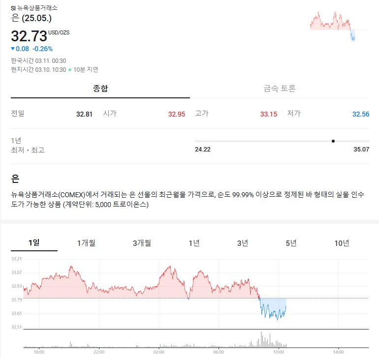 은값이 최근에 어떻게 변동하고 있는지, 현재 시장에서 팔고 살 때의 은값은 어떤지에 대해 알아보려 해요. 2025년 3월10일 현재 은값 시세는 달러기준 32.73(원화환산 47,686.33원) 인데요, 이는 전일 대비 0.26% 하락한 수치예요. 하루 시세 변동을 보면, opening price는32.95달러 (원화환산 48,006.86원) 이었고, 당일 최고가는 33.15달러 (원화환산 48,298.25원) 최저가는 32.56달러 (원화환산 47,438.65원) 입니다. 이러한 변동은 은값이 얼마나 변동성이 심한지를 보여주고 있어요.
