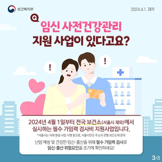 2024년 4월 1일부터 정부는 임신을 희망하는 부부를 위해 '임신 사전 건강관리 지원 사업'을 시행할 예정이에요. 이 정책은 건강한 임신을 위한 필수 검사를 지원하고, 가임기 남녀의 건강을 증진하는데 큰 도움이 될 거예요.
