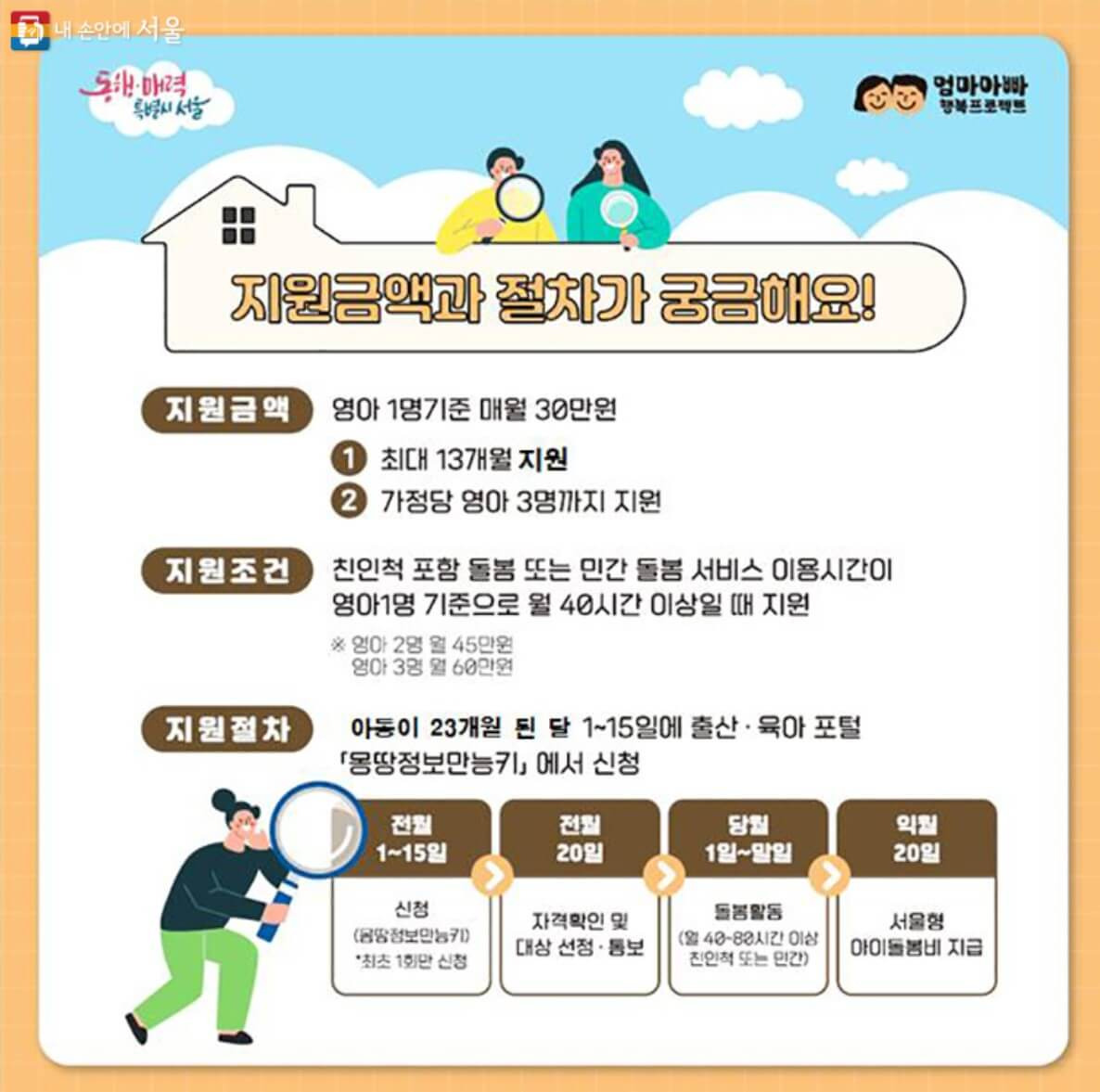 서울시의 경우, 조부모가 4촌 이내 친척이거나 민간 아이돌봄 서비스 이용 시 지원해 주고 있어요. 경기도 역시 비슷한 조건을 가지고 있지만, 추가적인 세부사항이 있어요. 더 많은 정보는 서울시청 공식 웹사이트나 경기도청 웹사이트를 통해 확인할 수 있어요.