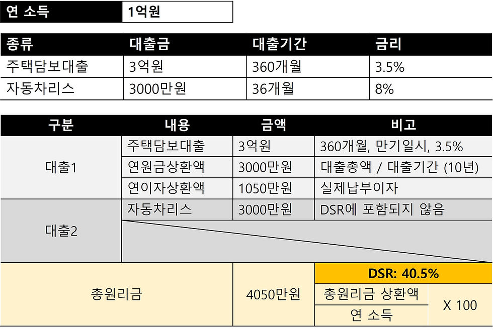 - DSR은 아래와 같이 계산됩니다: DSR=연간 대출 상환액연간 총소득×100\text{DSR} = \frac{\text{연간 대출 상환액}}{\text{연간 총소득}} \times 100