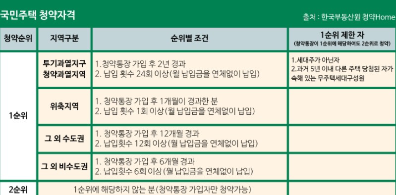 국민주택의1순위 조건은 무주택 세대주나 세대원이면서 해당 주택 건설지역에 거주해야 하죠. 청약통장 조건은 투기 과열 지구, 청약 과열 지역이라면 가입기간 2년 이상, 총 납입횟수 24회 이상이어야 하고, 그외 수도권은 가입기간 1년 이상에 납입횟수 12회, 수도권 외 지역은 6개월 이상 6회 이상 납입해야 합니다.