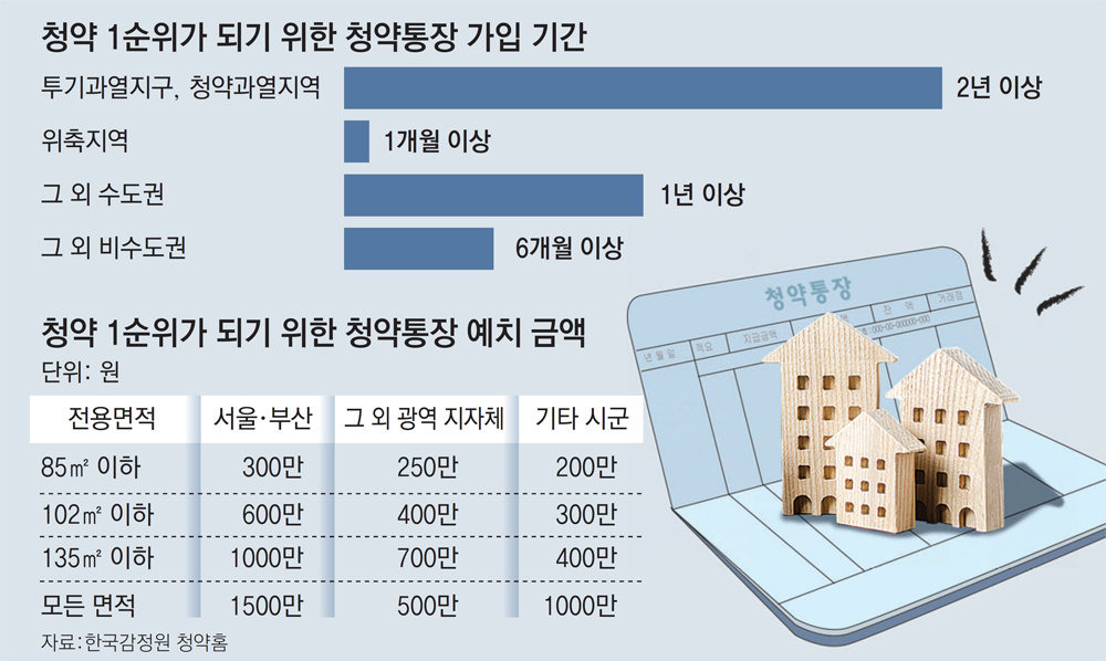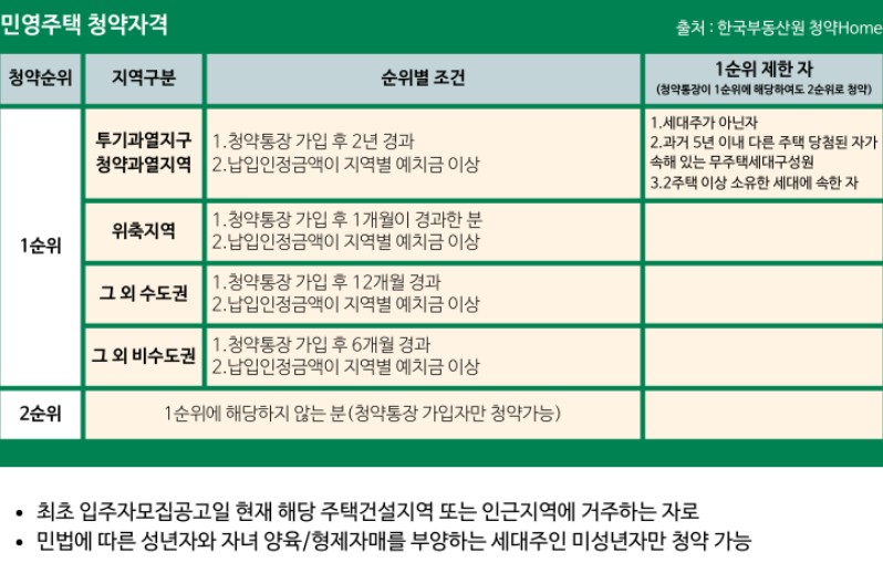 민영주택 청약 1순위 조건이 되기 위해선 무주택자 또는 1주택 소유자로 주민등록등본상 세대주여야 하고, 해당 주택 건설지역에 2년 이상 거주해야 해요. 또한 청약통장 관련하여 지역과 면적에 따른 예치금 기준에도 충족해야 합니다.
