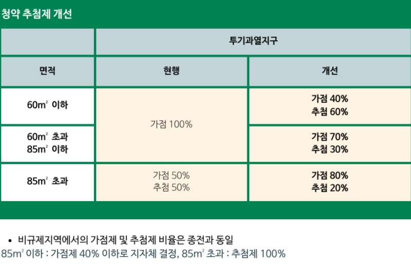 국토교통부는 주택공급에 관한 규칙을 개정해 강남·서초·송파·용산구를 제외한 전지역을 비규제지역으로 바꾸면서 2023년 4월 1일 이후 입주자 모집공고 승인 신청분부터 기존에 투기과열지구 또는 청약과열지역에 속하여 추첨제 제한이 있던 곳에서도 추첨 100%로 중대형을 공급할 수 있게 되었습니다. 이러한 추첨제 대상 완화로 부양가족이 적은 경우, 1인 가구 또는 유주택자에게 아파트 당첨의 기회가 확대된 거죠.