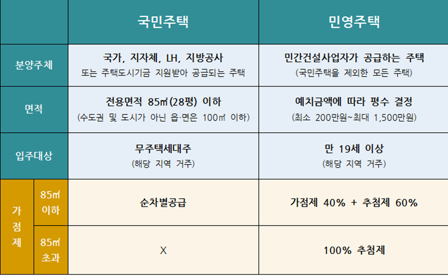 국민주택과 민영주택의 가장 큰 차이점은 제공 주체와 크기 제한이에요. 국민주택은 정부에서 제공하는 주택으로, 85㎡ 이하의 면적만 해당되며, 민영주택은 민간 건설업체가 제공하는 주택이에요.