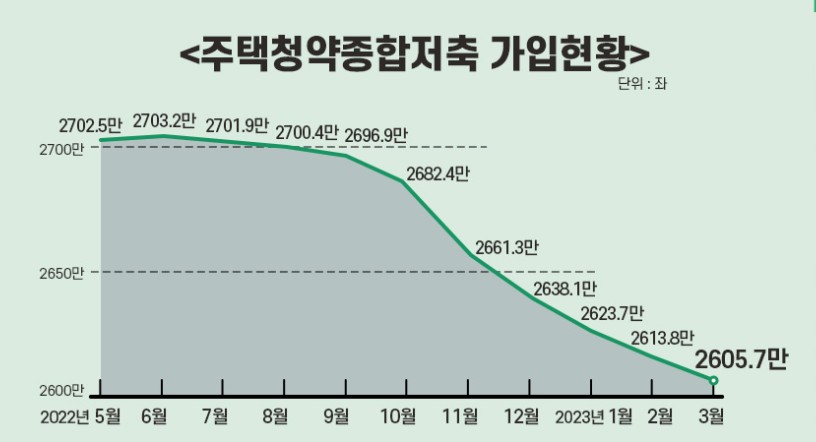 한국부동산원 청약 Home에서 제공하는 청약통장 가입현황에 따르면 주택청약종합저축 가입자 수는 2022년 7월 이후부터 감소세에 접어들었습니다.