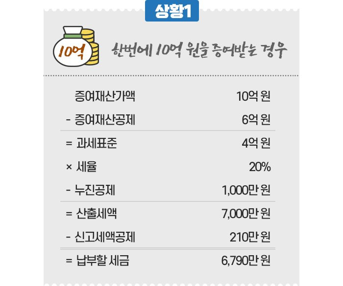 증여세는 증여받은 재산의 가치에서 면제 한도를 뺀 후, 해당 금액에 세율을 적용하여 계산합니다. 예를 들어, 10억 원을 증여받고 면제 한도가 5천만 원이라면, 9억 5천만 원에 대해 세율을 적용합니다.