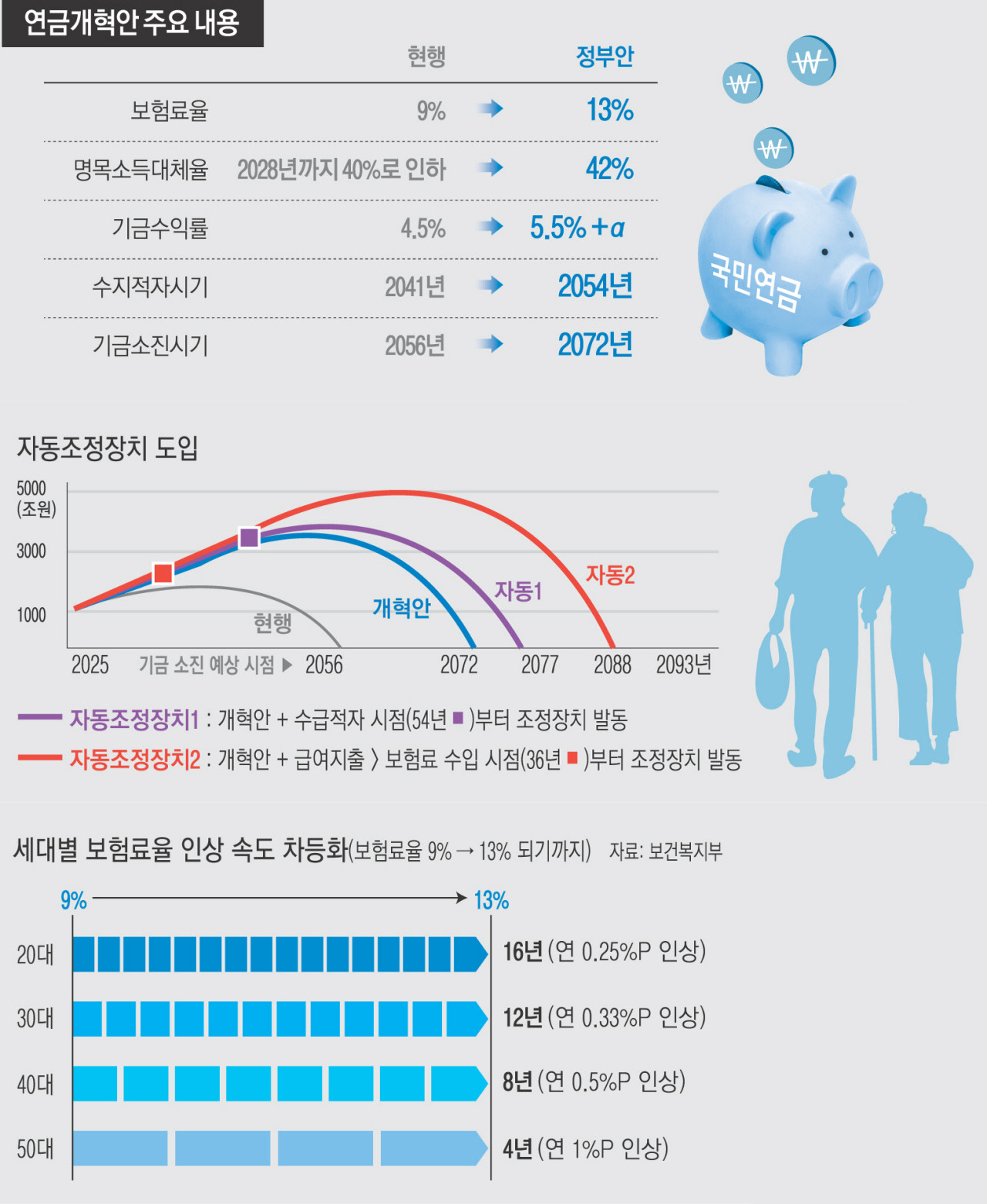 국민연금개혁안은 크게 보험료율 인상과 소득대체율 변화, 그리고 연금 수급액의 변화로 요약될 수 있어요.