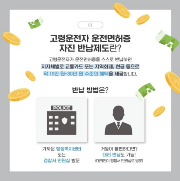 서울시에서는 70세 이상의 어르신들을 대상으로 한 운전면허 자진 반납 프로그램을 운영하고 있어요. 이 프로그램은 노인들이 자발적으로 운전면허를 반납할 수 있도록 유도하며, 동시에 교통카드를 신청하는 방법도 제공하고 있답니다.