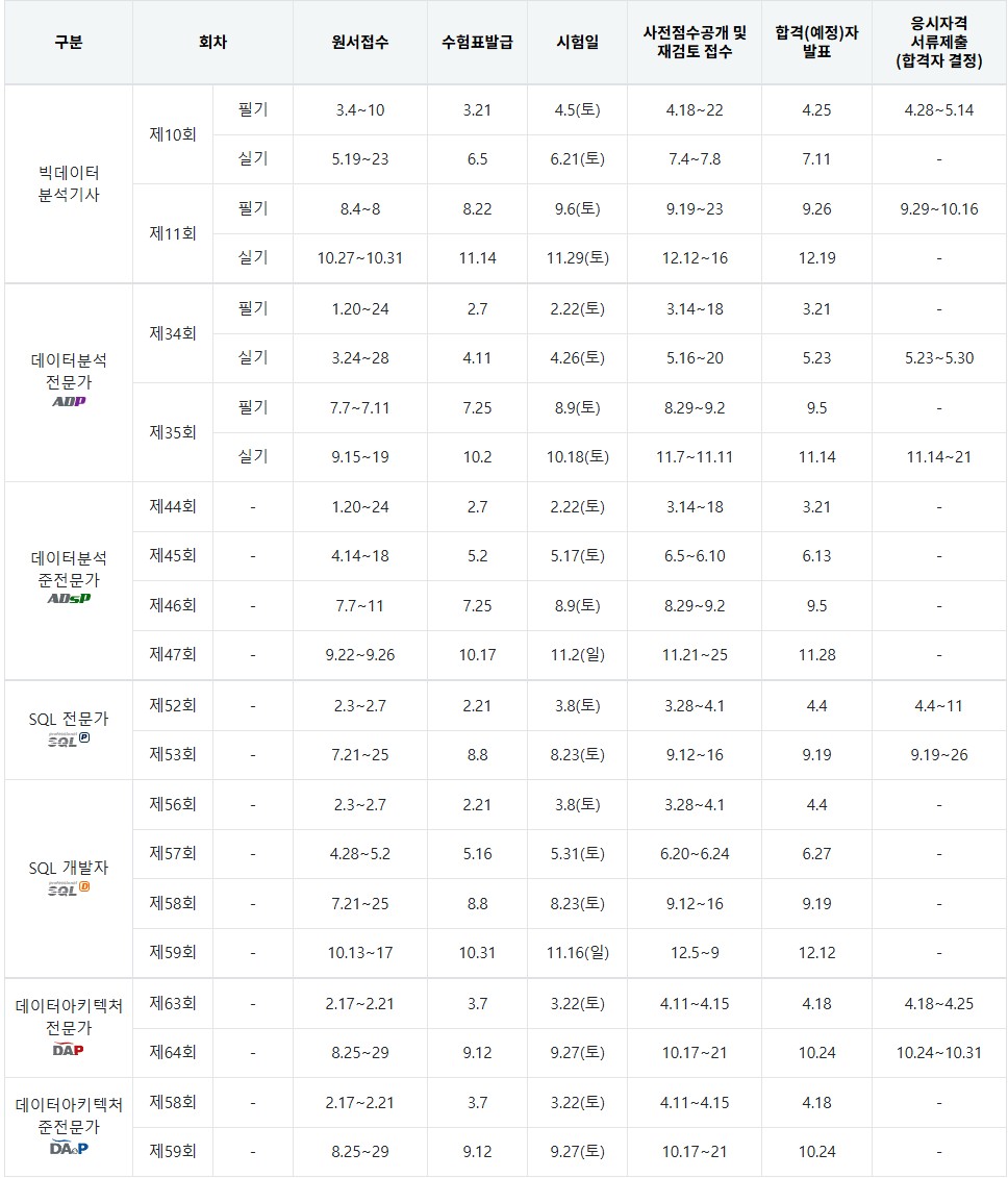 ※ 정확한 시험일정은 한국데이터산업진흥원 공식 홈페이지에서 확인하시기 바랍니다.